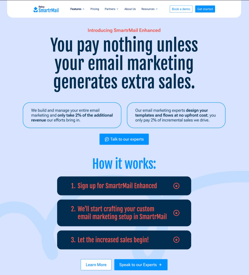 • Custom email marketing setup managed by SmartrMail’s experts, including templates and flows created with no upfront cost