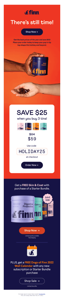 If you’ve already sent out a teaser email and/or a gift guide, then it’s likely your customers will already have a few products in mind that they want to buy. At this point, often a simple discount offer will be enough to convert shoppers.