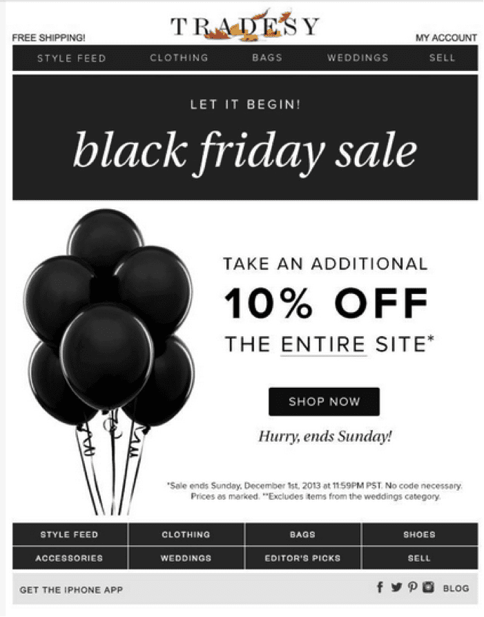 What I like about this email: The inclusion of “Hurry, ends Sunday!” increases the sense of urgency with this email. Tradesy’s Black Friday offer is also really clear, with the inclusion of conditions in fine print as well.