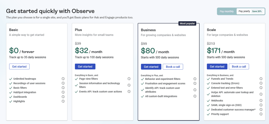 The starting plan is priced at $32/month. They also offer a forever-free plan with unlimited heatmaps. Learn more about their pricing.