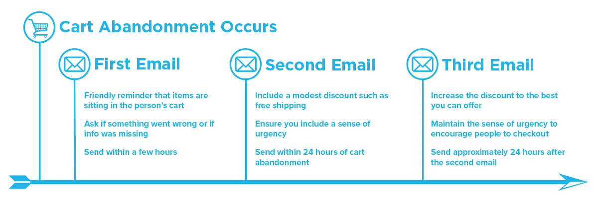 We recommend sending the second email within 24 hours after someone abandoned their cart, and a third, final email another 24 hours later. Best practice is to include a modest discount in the second email such as free shipping if you charge for shipping while leaving your best offer for the final abandoned cart email.