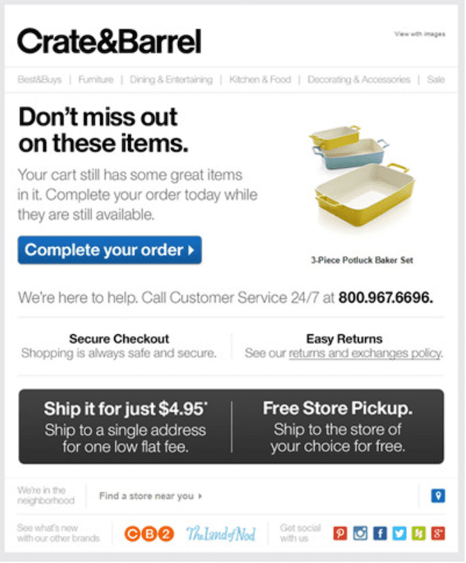 Usually the first email is a simple reminder to catch people who have simply forgotten about their purchase that you send within a couple of hours. You don’t typically want to include any discounts or special offers in this email as chances are it’ll already achieve a decent conversion rate anyway.