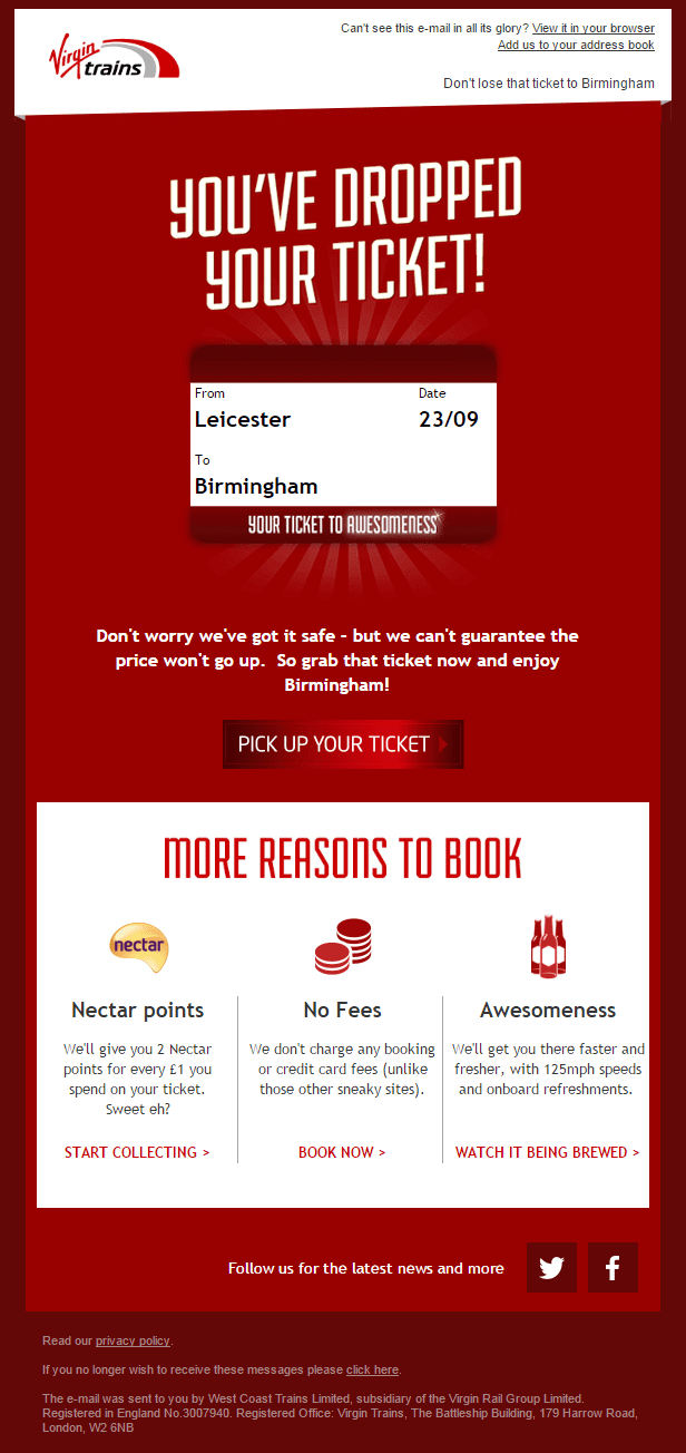 Whatever your branding is, your abandoned cart emails should remain consistent with it. If your brand is fun and playful, so should your abandoned cart emails. Take the example from Virgin Trains below.